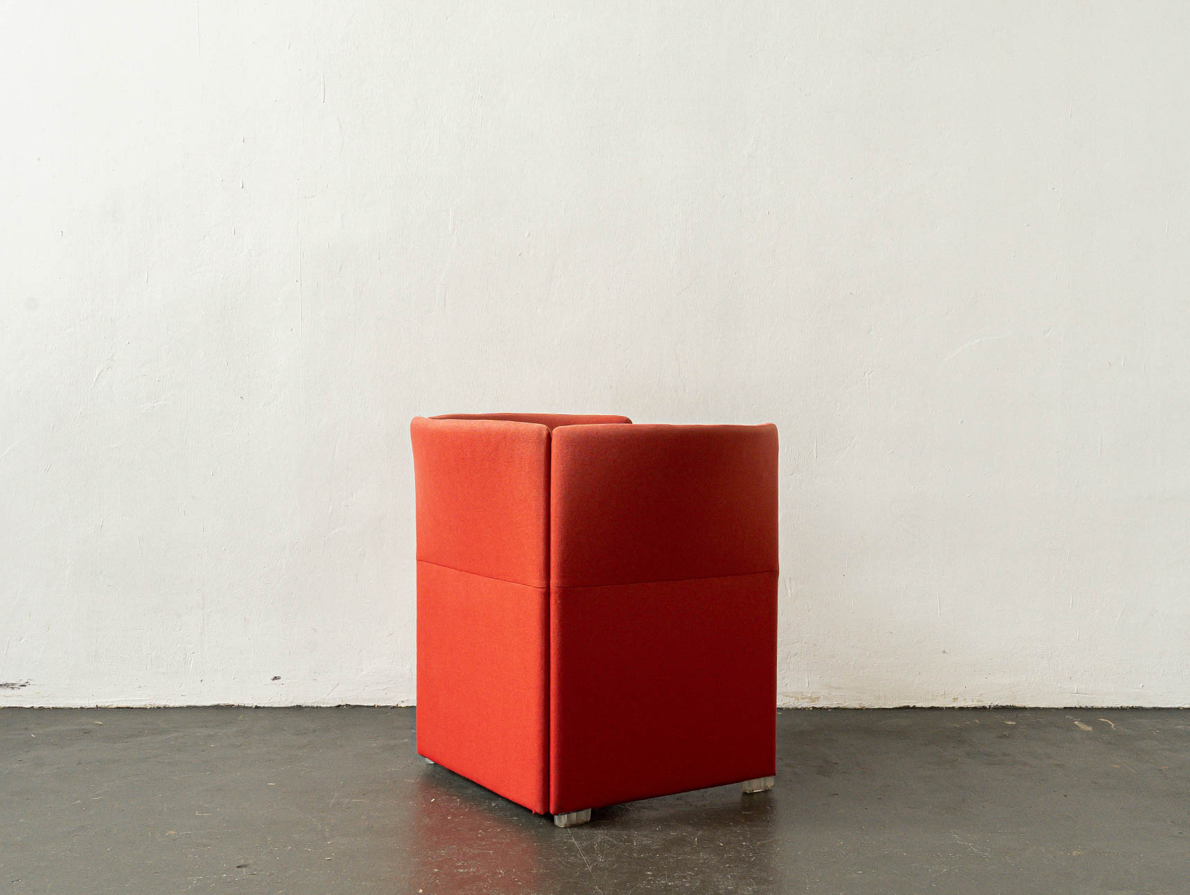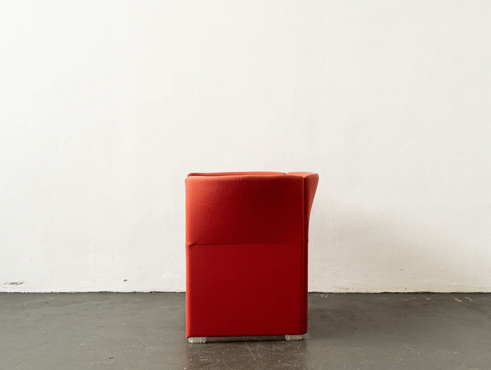 The Farfalla armchair, designed by architect Masayuki Kurokawa for Cassina IXC, features a circular butterfly-inspired design that enhances modern living spaces. This version is upholstered in red brushed cotton textile with molded polyurethane foam padding and steel frame. The chair sits on leg gliders for easy movement and is sold individually. Materials include textile, molded polyurethane foam, and steel. Condition: Mint. Source: Shizuoka. Dimensions: L50 x D50 x H66 x SH41 cm.