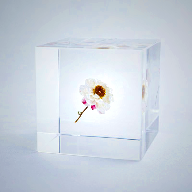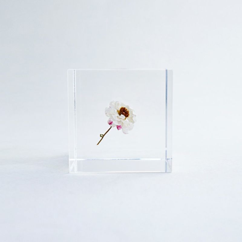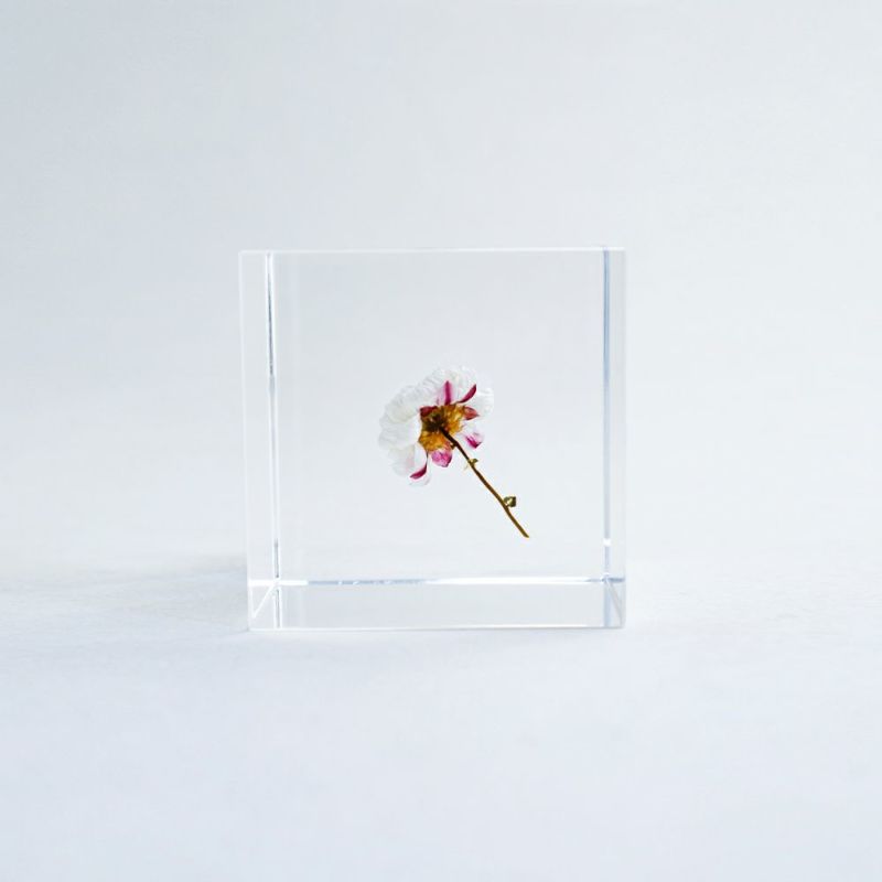 The Sola Cube – Chamomile Sunray showcases a naturally preserved chamomile flower encased in crystal-clear acrylic resin. Native to Australia and known as Hanakanzashi, this delicate white and purple bloom is a symbol of timeless beauty. Inspired by Shiro Kuramata’s design philosophy, each handmade cube from Usage No Nedoko in Kyoto captures nature’s fleeting moments in a functional art piece. The cube features a 4x4x4 cm design, crafted with dried plants and high-quality acrylic resin. Please avoid direct sunlight and high temperatures to preserve its appearance.