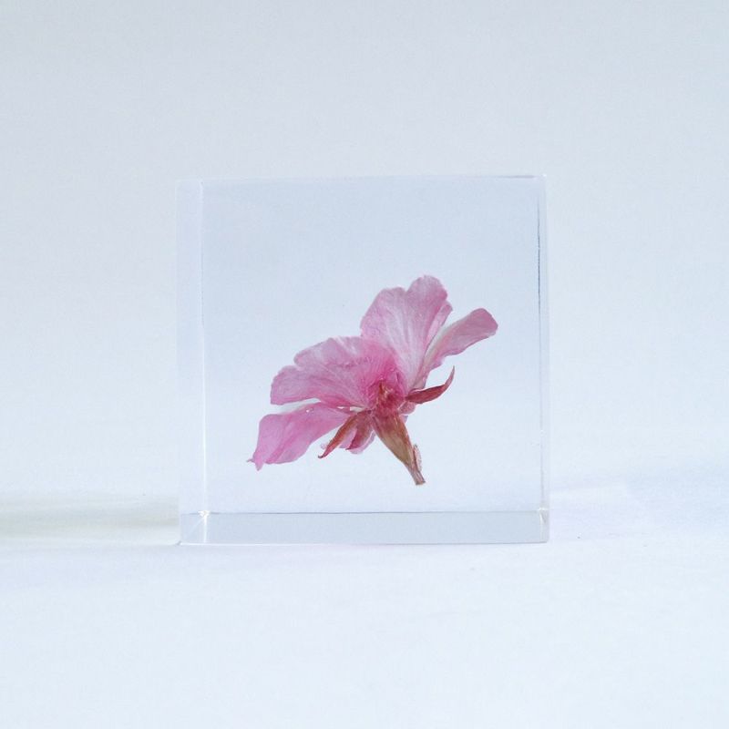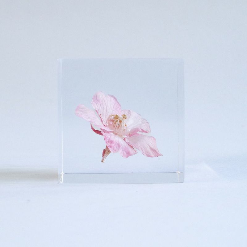 The Sakura Kawazu-zakura is an early-blooming cherry blossom variety from Kawazu City, Japan, celebrated for its vibrant spring beauty. Sola Cubes by Usage No Nedoko encapsulate this natural wonder in handcrafted acrylic resin, preserving real flowers and leaves as timeless art pieces. Each cube measures 4x4x4 cm and features unique organic elements, reflecting Japanese craftsmanship and reverence for nature. Display indoors away from sunlight and heat to maintain clarity and color.