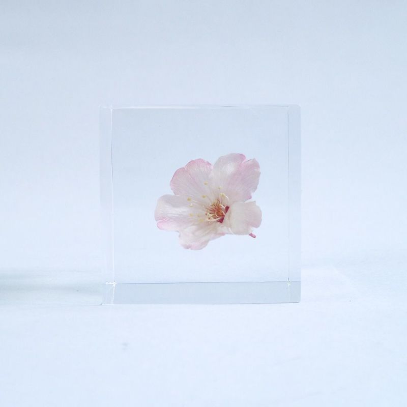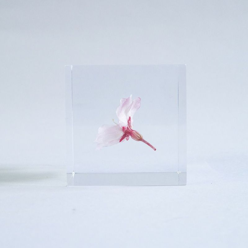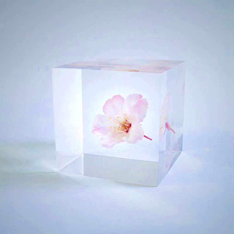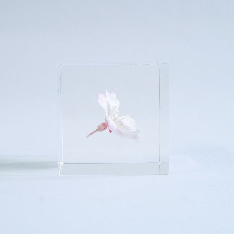 The Sakura Komatsu-otome Sola Cube features a preserved cherry blossom with rounded petals and delicate coloring, encapsulated in crystal-clear acrylic resin. Inspired by Shiro Kuramata’s design philosophy, this handmade piece from Usage No Nedoko in Kyoto reflects nature’s fleeting beauty. Each cube is unique, containing real organic materials and embodying traditional Japanese craftsmanship.