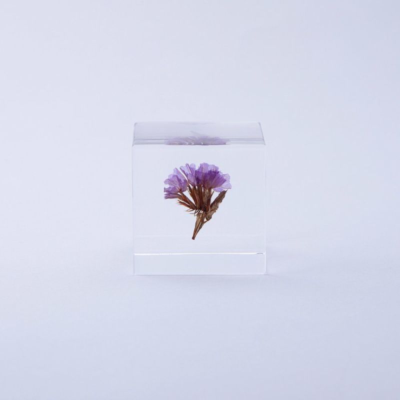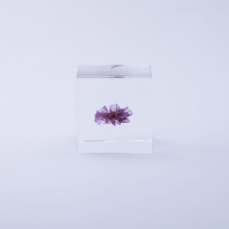 The Sola Cube – Statice features a beautifully preserved statice flower encased in crystal-clear acrylic resin. Inspired by Shiro Kuramata’s design philosophy, this Kyoto-crafted piece captures nature’s fleeting beauty for meditative display. Each cube is handmade with dried plants and high-quality acrylic, making every piece unique. Dimensions: 4 x 4 x 4 cm. Material: Acrylic Resin, Dried Plants. Source: Kyoto. Note: Avoid direct sunlight and high temperatures to prevent discoloration.