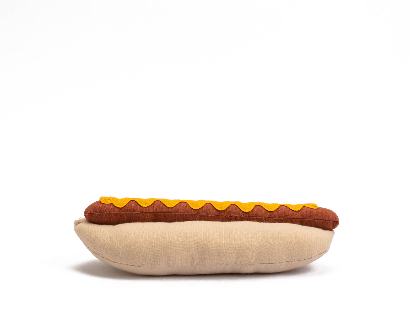 This unique hotdog features a playful design with mustard and comes with a wrapper. Unlike real food, this decorative piece lasts forever.